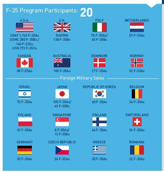 对于绝大多数盟国来说,选择F-35与否与其说是为了战斗力,不如说是为了装备更新换代。盟国中现有战斗机以F-16、F-18为主,大多面临寿命到期问题,换用F-35很自然。在现有和潜在F-35用户中,澳大利亚、加拿大、芬兰、西班牙、瑞士都是F-18用户,比利时、丹麦、荷兰、挪威、希腊、意大利、波兰、罗马尼亚、新加坡、韩国都是F-16用户。多数是从新用到旧,少数是从二手F-16开始,从旧用到更旧。只有捷克(“鹰狮”用户)、英国和德国(“台风”、“狂风”用户)、日本(F-15和三菱F-2用户,后者与F-16高度相似)例外。